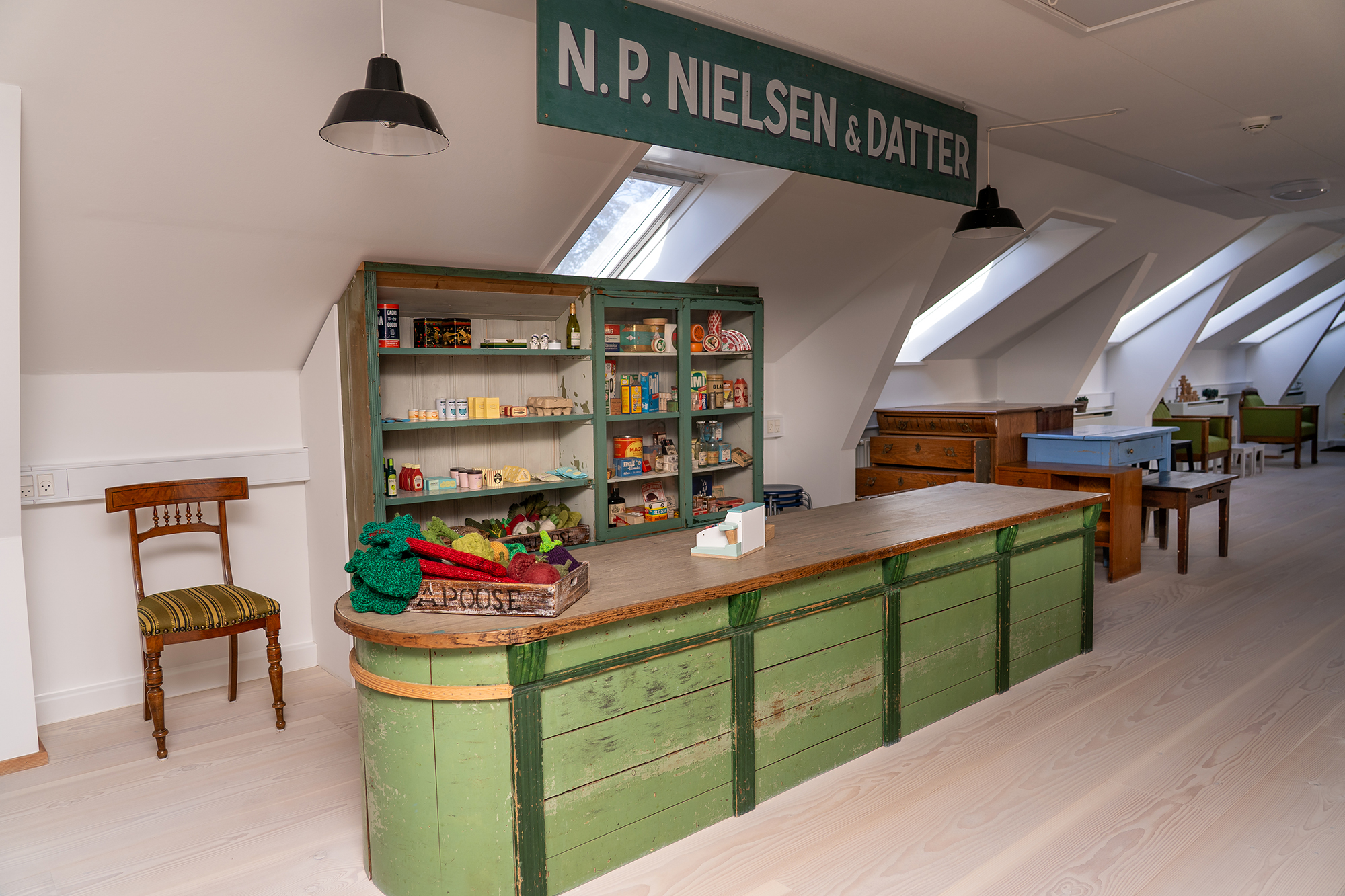 Du kan lege i købmandsbutikken N.P. Nielsen og Datter, hvor Dagny med sin søster Gerda havde butikken, mens deres bror Øjvind kørte lastbil med frugt og grønt.
