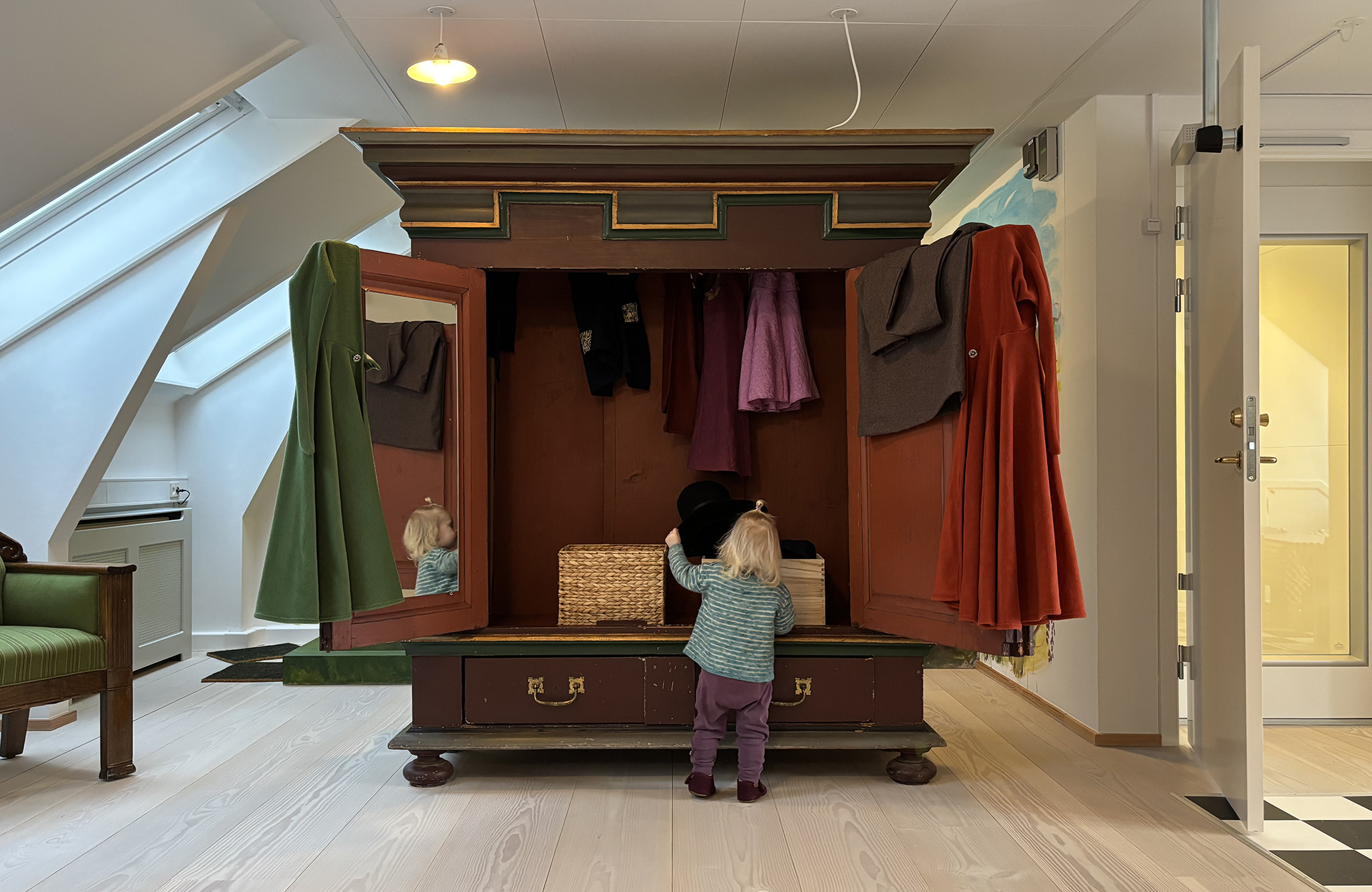 Oppe under loftet finder du Pulterkammeret, hvor der er plads til leg og undersøgelse. I de andre udstillinger er alt bag glas, men her kan børn og barnlige sjæle lege med historien.